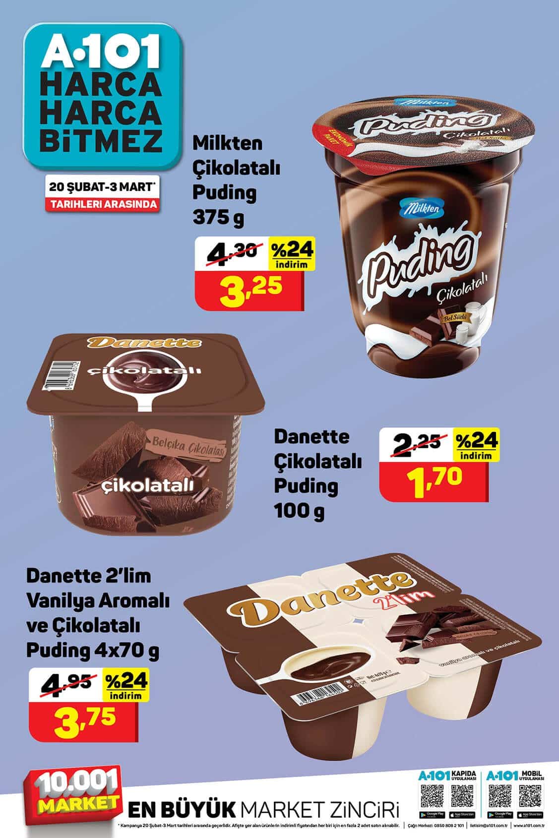 A101 20 Şubat – 6 Mart 2021 Aktüel Ürün Kataloğu yayınlandı. Tek sayfalık indirim broşürüne göre Milkten Çikolatalı Puding 3,25 TL , Danette Çikolatalı Puding 1,70 TL, Danette 2'lim Vanilya Aromalı ve Çikolatalı Puding 4×70 gr, 3,75 TL. Fırsatlarla dolu A101 indirimlerini kaçırmayın.