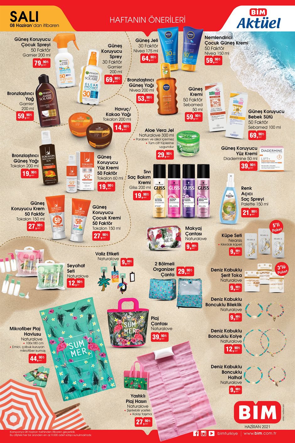 Bim 8 Haziran 2021 Aktüel Ürünler Kataloğu yayınlandı. Tatil hazırlığı yapanlar için çeşitli ürünler indirime giriyor. Güneş kremleri, saç bakım ürünleri, seyahat setleri, plaj havlusu, plaj çantası gibi seyahat ürünlerinin yanı sıra pek çok yiyecek ve içecek, atıştırmalık ürünler de indirimli fiyatlarla raflarda yerini alacak.