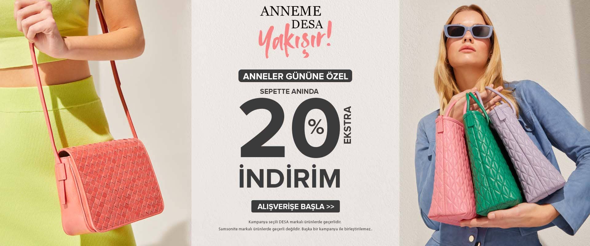 Annene yakışacak rengarenk, şık ve konforlu çantalar için desa.com.tr’de seni bekliyor. Dilerseniz çanta, dilerseniz ayakkabı… Anneler Günü hediyesi için hem trend hem konforlu seçenekler Desa'da…