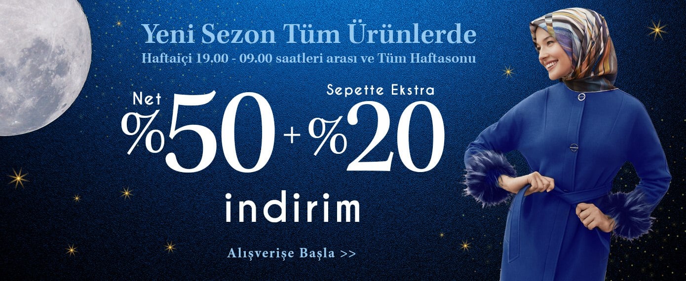 Armine birbirinden güzel tesettür giyim ürünlerini indirimli fiyatlarla sizlerle buluşturuyor. Hafta içi saat 19.00-09.00 saatleri arasında ve hafta sonu geçerli bu indirimleri kaçırmayın. Net %50 indirime ek sepette ekstra %20 indirim Armine'de!