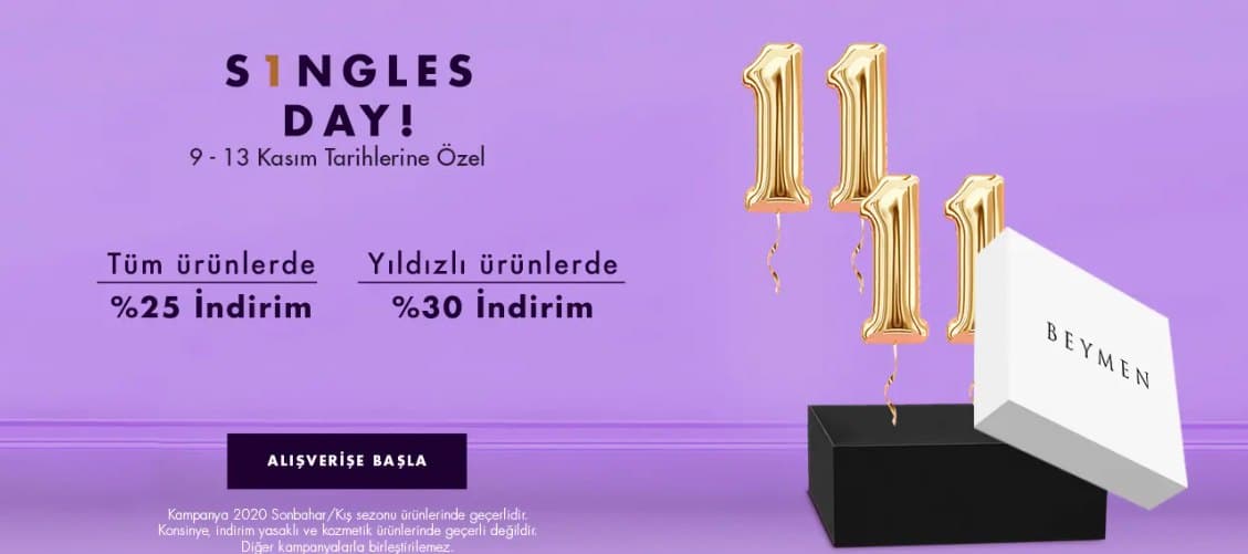Beymen'de 9-13 tarihleri arasında geçerli Single's Day kampanyasından faydalanmak için elinizi çabuk tutun. Tüm ürünlerde geçerli %25 ve yıldızlı ürünlerde geçerli %30 indirimi yakalayın. Kadın ve erkek giyim, ayakkabı ve çantalar olmak üzere çok sayıda üründe muhteşem indirimler sizi bekliyor.