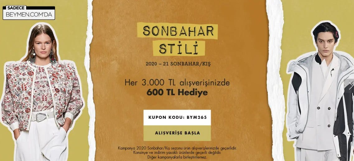 Beymen.com'da 2020 Sonbahar-Kış koleksiyonu ürünlerinde geçerli bu kampanyayla her 3.000₺'lik alışverişlerinizde 600₺ hediye kazanabilirsiniz. Aradığınız her şeyi tek bir adreste bulma imkanı sağlayan Beymen.com, sağladığı ürün çeşitliliğiyle alışverişin en keyifli adresi. Birbirinden kaliteli markaların en sevilen ve en yeni tasarımlarına Beymen ayrıcalıkları ve online alışveriş avantajlarıyla sahip olabilirsiniz. Beymen.com, dünyaca ünlü marka ve tasarımcıların en özel parçalarını bir araya getirerek trendlere yön veriyor.