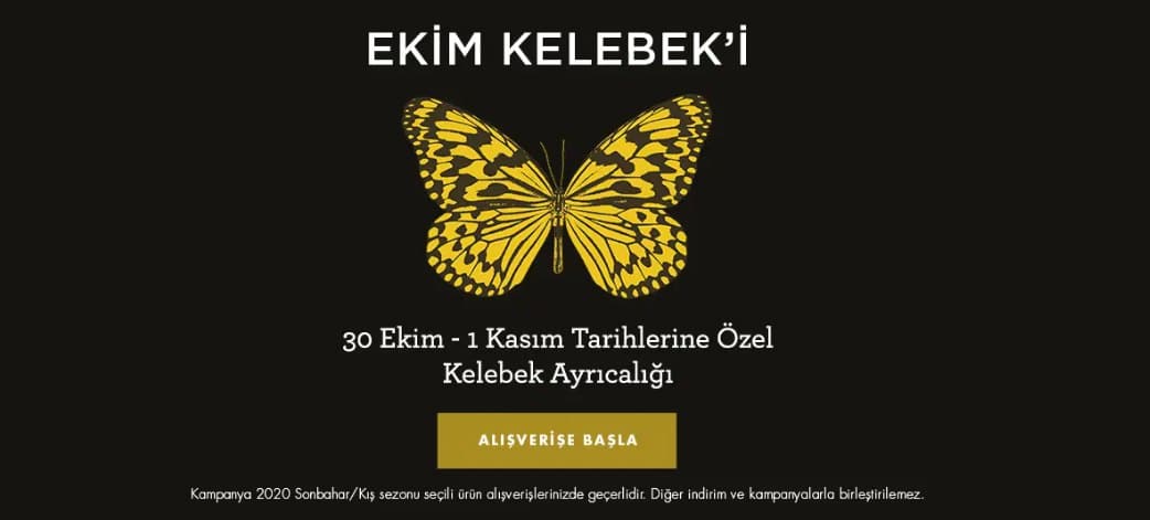 Beymen 2020 Sonhahar/Kış sezonu seçili ürünlerde geçerli %35 indirim fırsatı başladı. Sezonun en sevilen, en trend ürünlerine en uygun fiyatla sahip olmaya hazır mısınız? 30 Ekim-1 Kasım aralığında geçerli Kelebek ayrıcalığından faydalanın, sezonun trendini yakalayın.