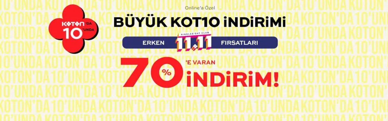 Kadın, erkek, genç, çocuk giyim, aksesuar kategorilerinde geçerli pek çok üründe %70'e varan indirim fırsatları sizleri bekliyor. Koton'un en sevilen, en tarz ürünleri arasından dilediğinizi seçin, indirimli fiyatlarla satın alın. Üstelik 200₺ ve üzeri alışverişlerinizde ücretsiz kargo imkanından faydalanabilirsiniz.Online alışverişlere özel bu kampanyayla gardrobunuzu yenileyin, tarzınızla göz kamaştırın!