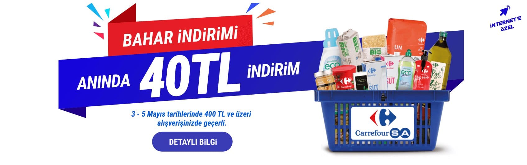 • 3 – 5 Mayıs tarihleri arasında www.carrefoursa.com internet sitesi ve CarrefourSA Online Market mobil uygulamasından yapılacak 400 TL ve üzeri alışverişte anında 40 TL indirim fırsatından yararlanılacaktır.