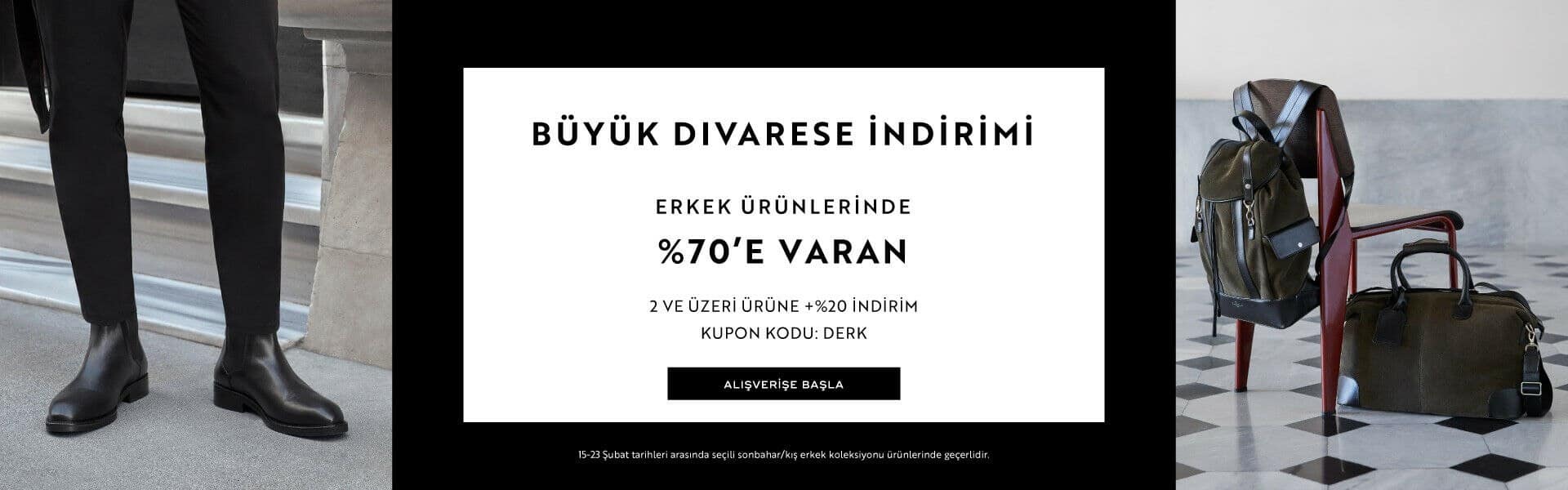 Dinamik ve modern adımlarda Divarese dokunuşu için indirimleri hemen keşfedin… Chelsea botlardan outdoor tasarımlara, Divarese kalitesi erkeklerin kış adımlarında! Üstelik mevcut %70'e varan indirime ek 2 ve üzeri ürün alımlarında %20 ek indirim kazanın. İndirim kodu: DERK