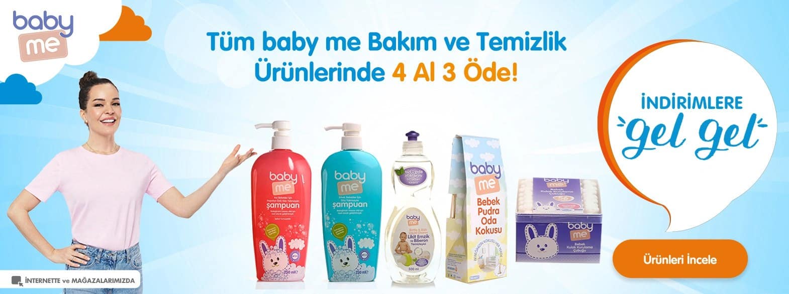 ebebek’e gel gel gel, indirimlere gel gel! Perşembe Pazar arası Tüm baby me Bakım ve Temizlik Ürünlerinde 4 Al 3 Öde fırsatı sizi bekliyor. Hemen incelemek için ebebek'i ziyaret edebilirsiniz.