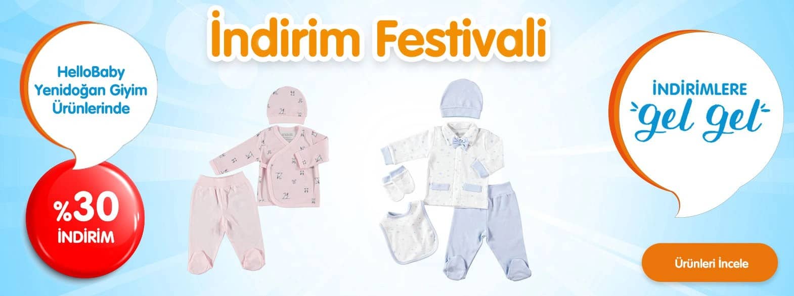 HelloBaby Yenidoğan Giyim Ürünlerinde %30’a varan indirimi kaçırmayın. Ürünleri hemen incelemek ve kolayca satın almak için ebebek mağazalarını ve online mağazayı ziyaret edebilirsiniz.