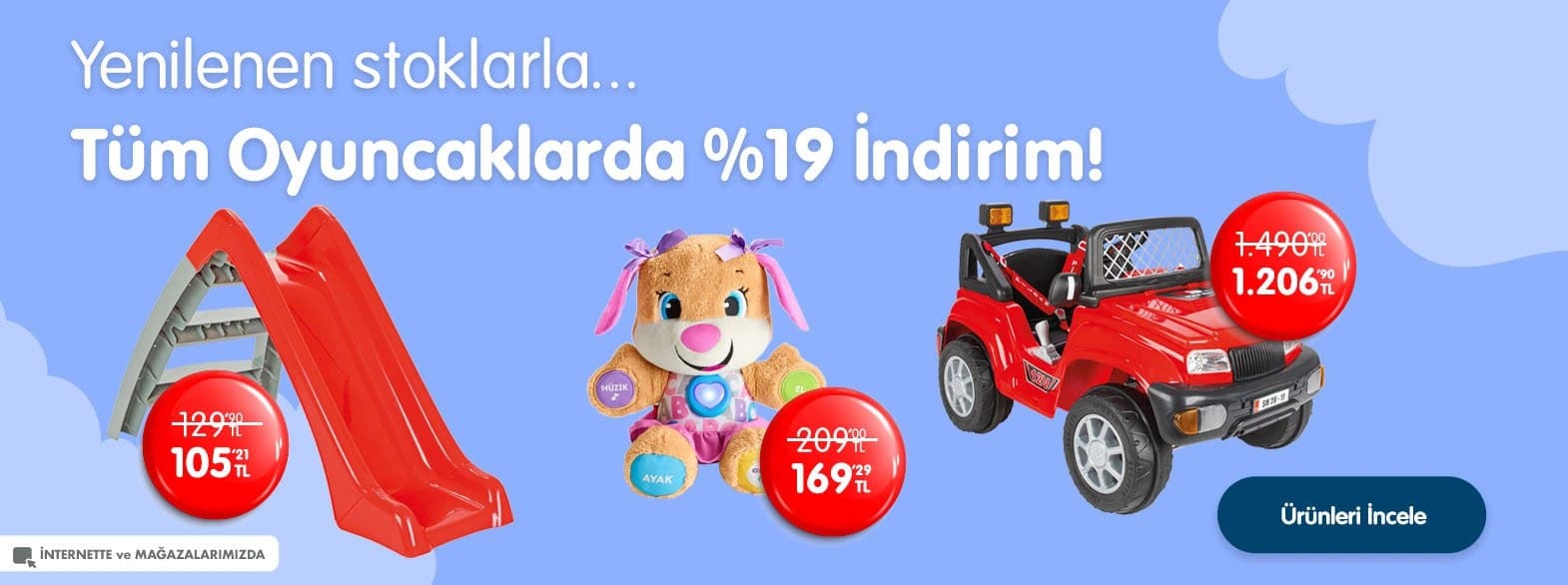 Yenilenen stoklarla Tüm Oyuncaklarda NET %19 İNDİRİM fırsatı ebebek mağazaları ve ebebek.com'da! Oyuncaklar ve akülü arabalarda geçerli fırsatlardan faydalanarak minikleri mutlu edebilirsiniz.