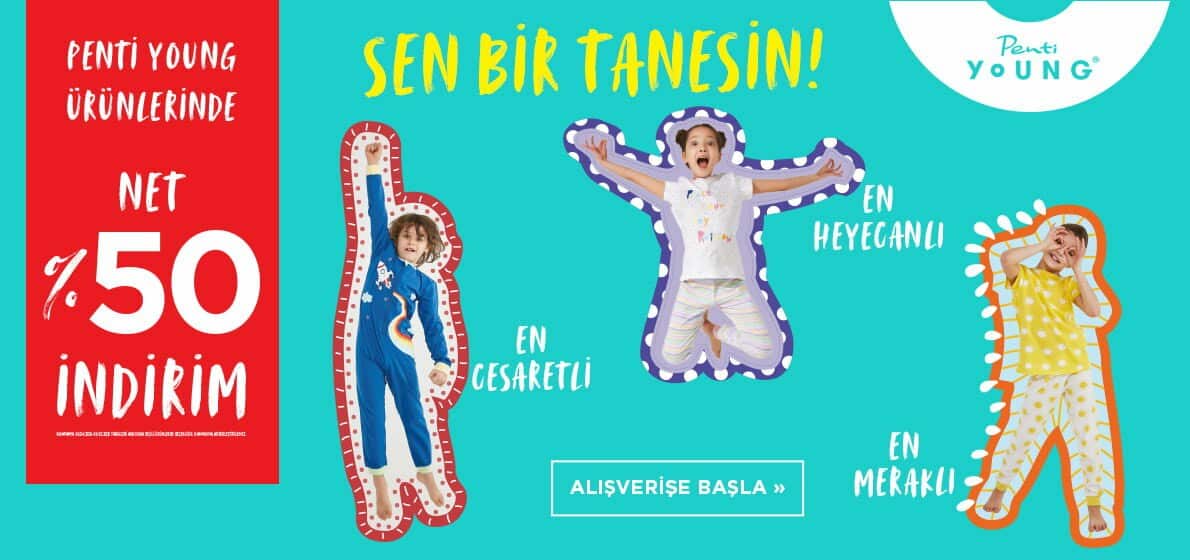 Neşenle "Sen Bir Tanesin" dediğimiz, hayat enerjimiz olan çocuklarımız için hazırlanan koleksiyonda geçerli indirimler sizi bekliyor. Yeni Sezon Penti Young ürünlerinde %50 indirim başladı!