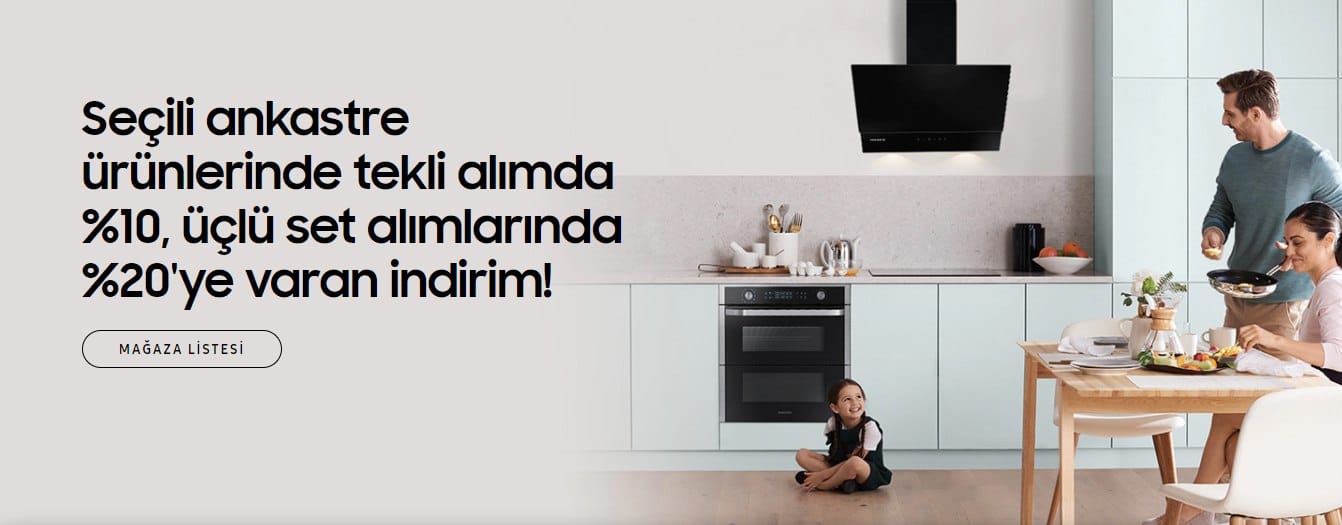 Samsung yetkili bayilerinden  01.12.2020 – 31.12.2020 tarihleri arasında satın alınmış kampanyaya dahil olan seçili Samsung marka ankastre fırın, ankastre ocak, ankastre davlumbaz ürün (‘Ürün/ler’) modelleri için geçerli olup; tüketiciler (“Katılımcı”) belirtilen ankastre grubu ürünlerinden ankastre fırın, ankastre ocak ve ankastre davlumbazı aynı anda satın alarak üçlü set oluşturdukları takdirde kampanyadan yararlanarak, ankastre üçlü setin (ankastre fırın, ankastre ocak ve ankastre davlumbaz) KDV Dahil satış fiyatı üzerinden %20’ye varan indirim fırsatı yakalayacaklardır. Tekli alımlarda ise seçili ürünlerin KDV dahil satış fiyatı üzerinden (fırın, ocak veya davlumbaz) %10 indirim sağlanacaktır.