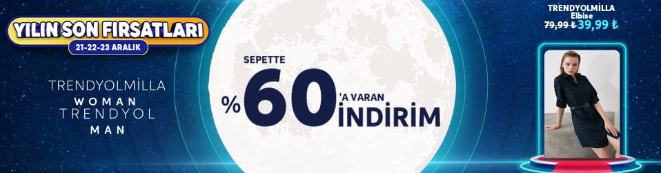 Trendyol'un sevilen butiği Trendyol Man ve Trendyol Milla'da geçerli sepette %60'a varan indirim fırsatları başladı! 23 Aralık tarihine kadar geçerli yılın son fırsatlarından faydalanın, dolabınızda yepyeni trend ürünlere yer açın.