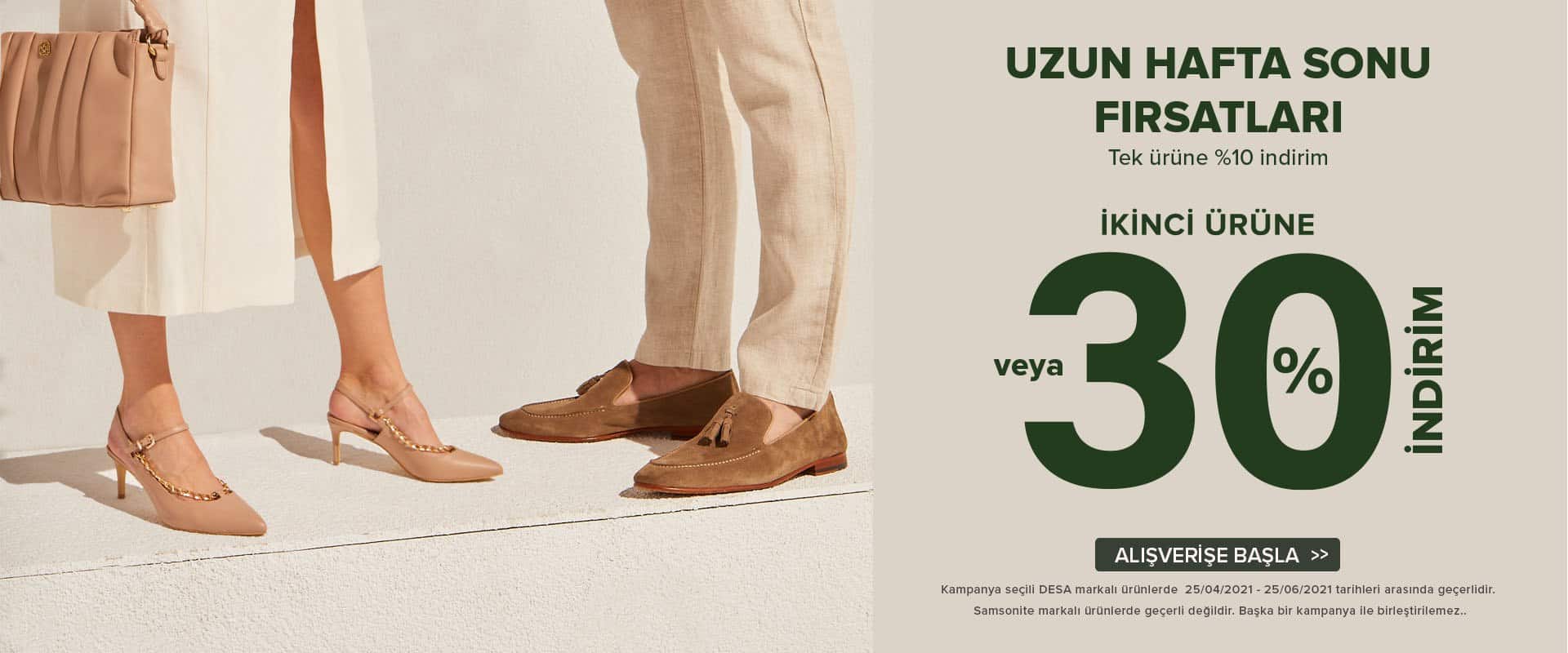 DESA renkleri ile göz kamaştıracağınız dinamik ve konforlu bir sezona merhaba! En şık ve rahat ayakkabı modellerinde geçerli ilk üründe %10, ikinci üründe %30 indirimi sakın kaçırmayın.